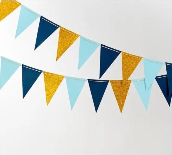 Ljósblá, dökkblá og gyllt glimmer fánalengja 3m