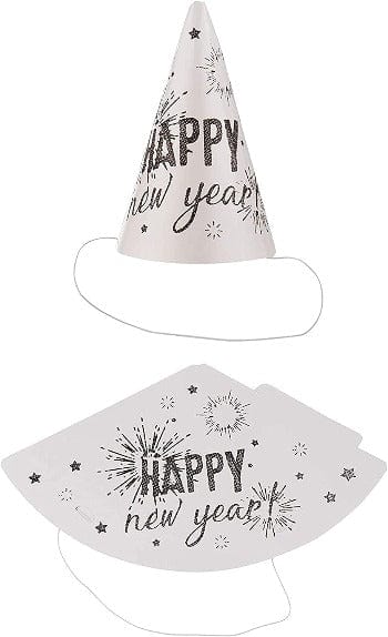 Hvítur "Happy New Year" strýtuhattur með svörtu glimmeri