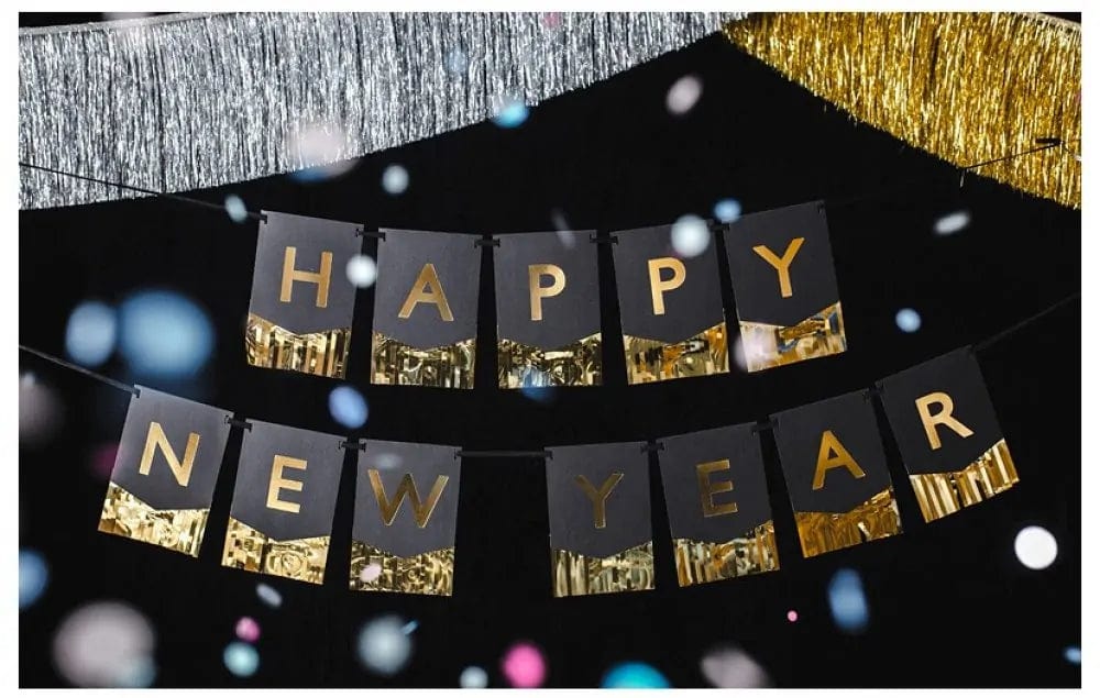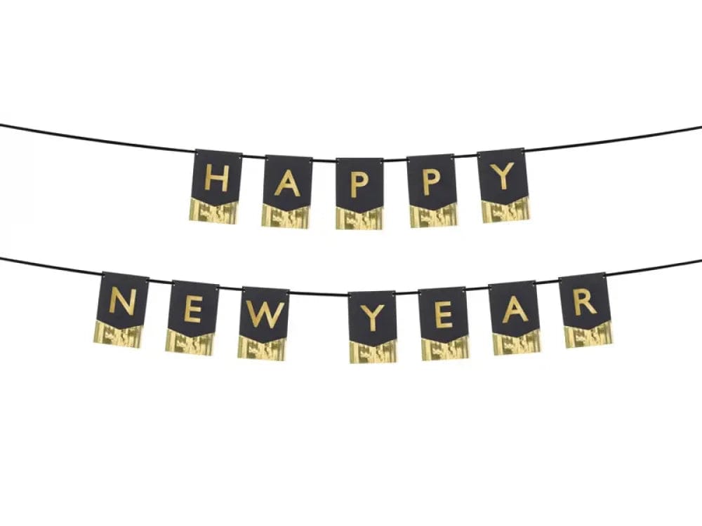 Svört, gyllt og silfur “happy new year” stjörnu álblaðra