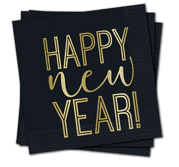 Svartar og gylltar "Happy New Year" matarservíettur - 16stk