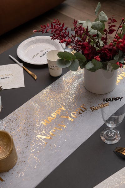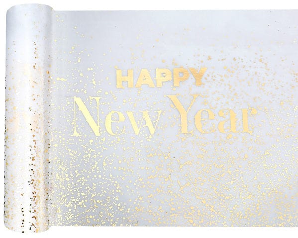 Hvítur og gylltur "Happy New Year" borðrenningur 28cm x 5m