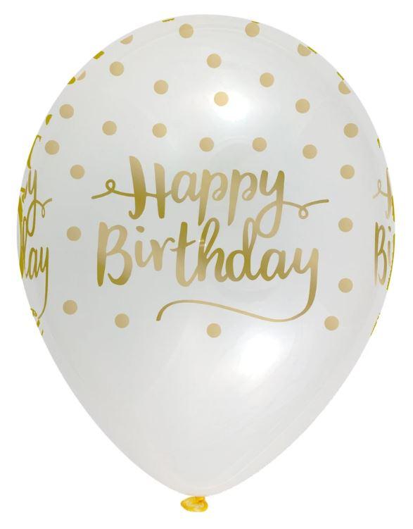 Glær blaðra með gylltu "happy birthday" og doppum - 30cm
