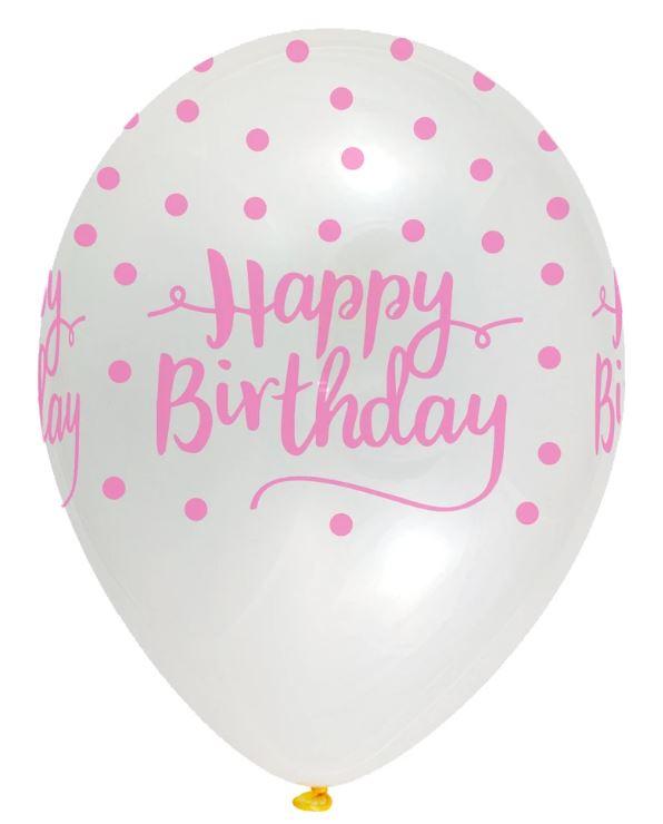 Glær blaðra með bleiku "happy birthday" og doppum - 30cm
