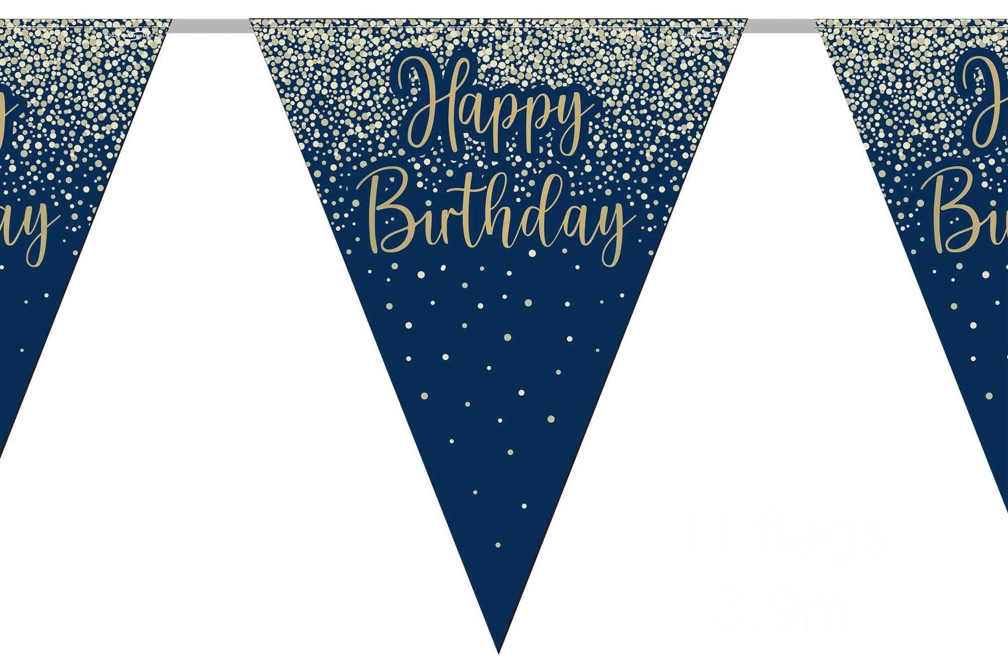 Navy blà og gyllt Happy Birthday fánalengja 3,9m