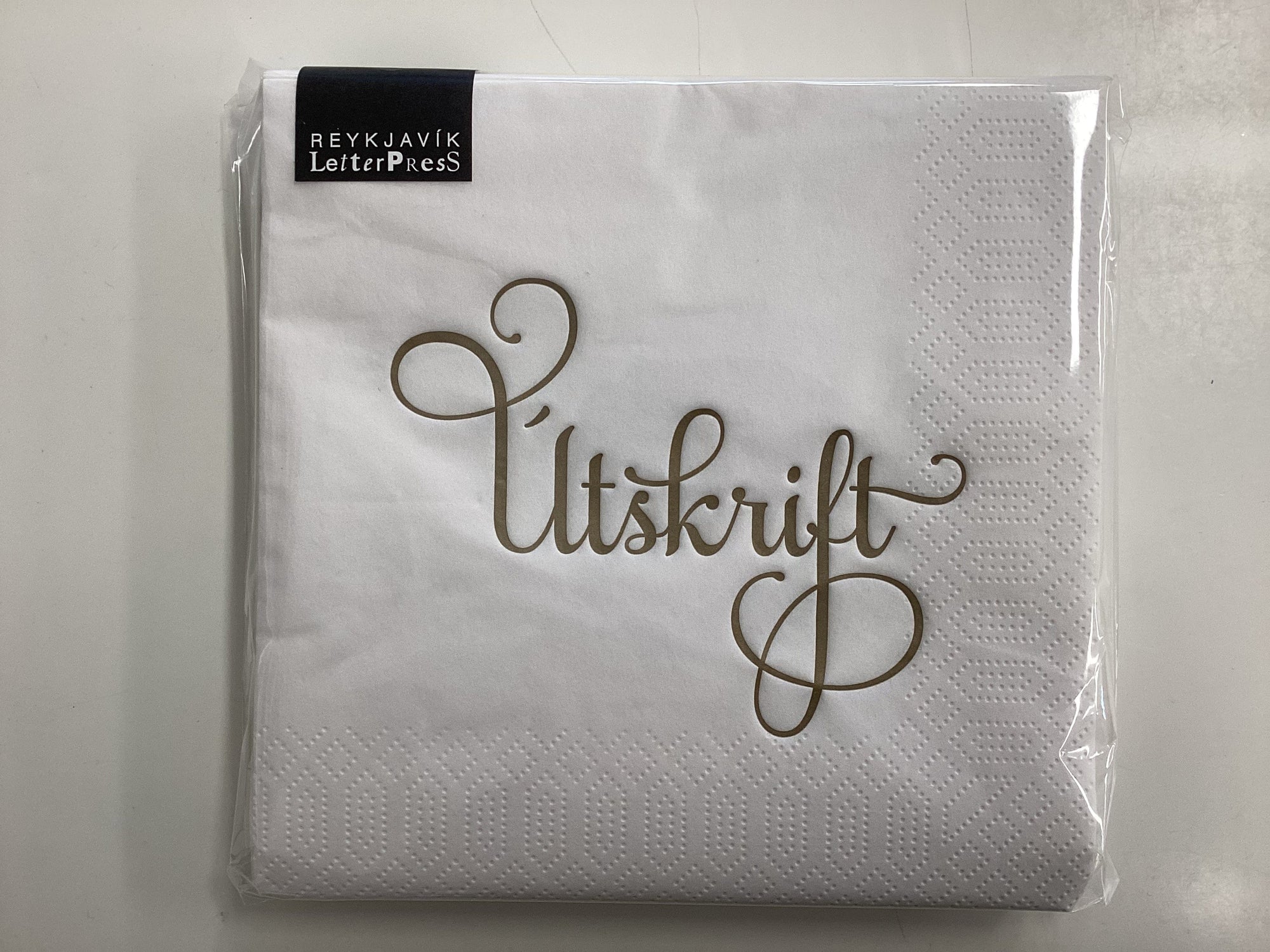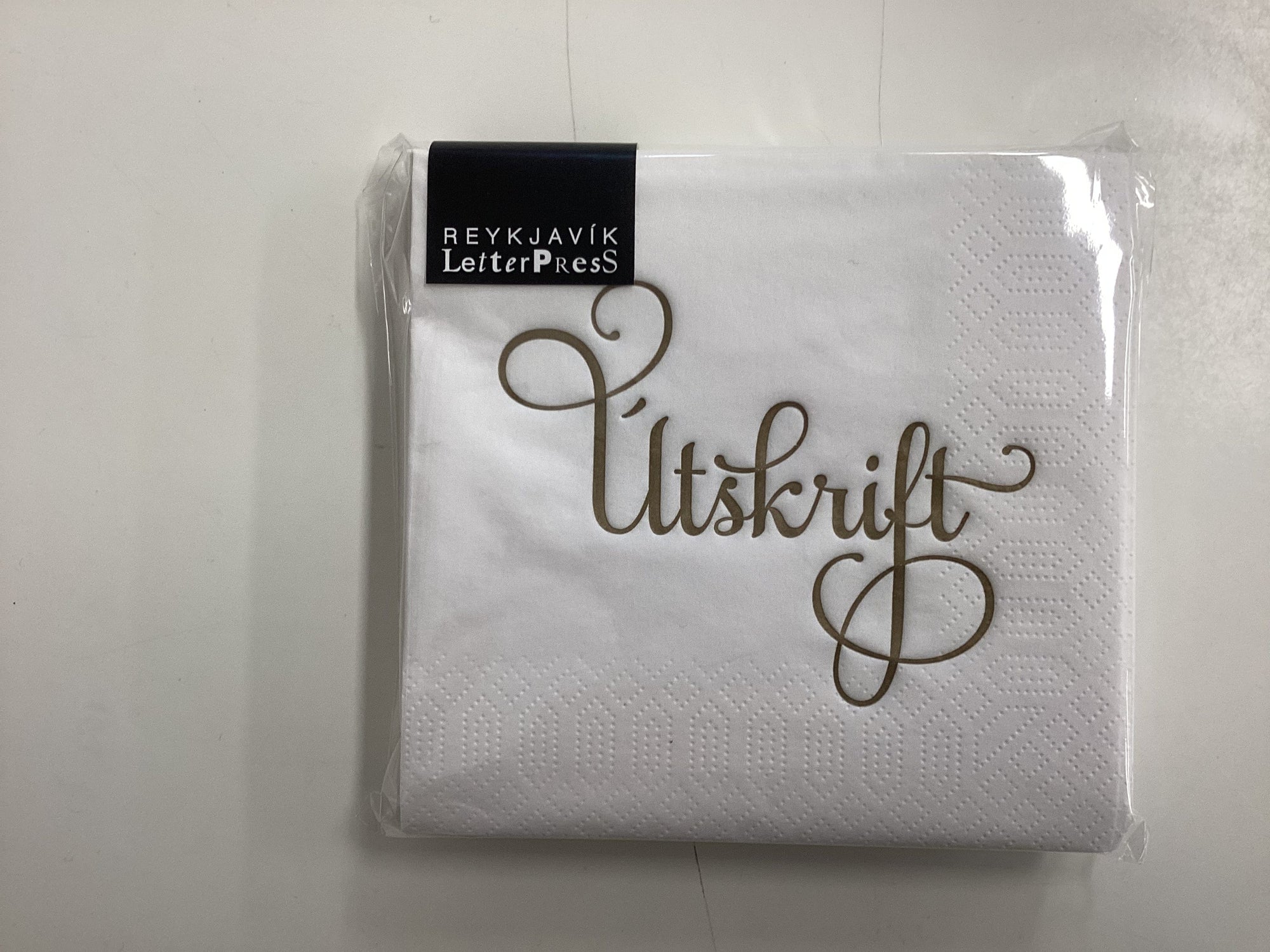 Hvítar "Útskrift" kaffiservíettur með gylltri merkingu 20 stk